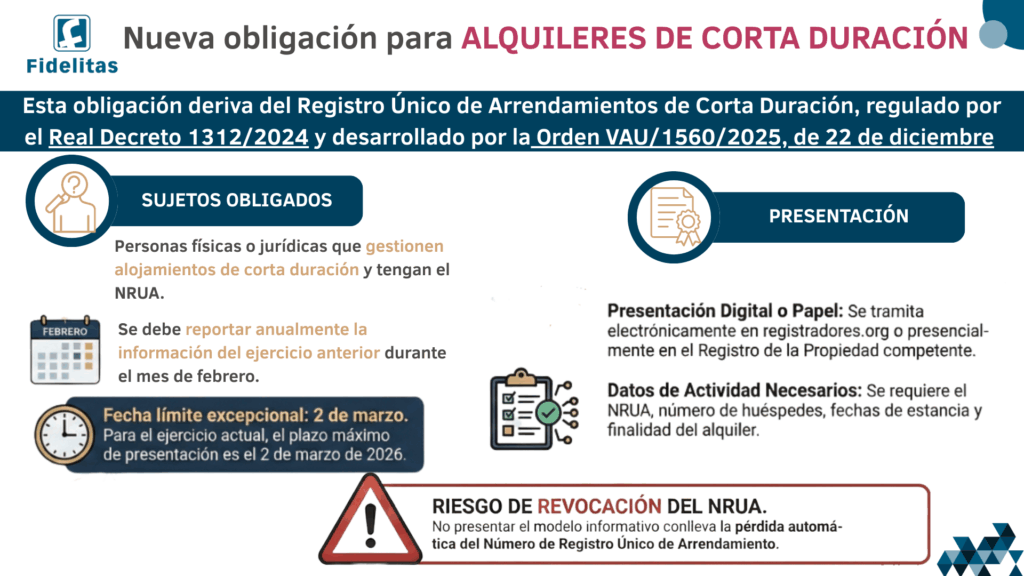 La normativa establece la obligación de aportar cada doce meses un modelo informativo de arrendamientos de corta duración, que deberá depositarse en el Registro competente.