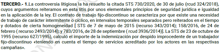 “…la indemnización por despido de los trabajadores fijos-discontinuos no se calcula sobre la base de los años naturales en que haya estado en la empresa sino con base en los periodos de actividad, en los que el trabajador haya prestado efectivamente servicios.”