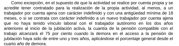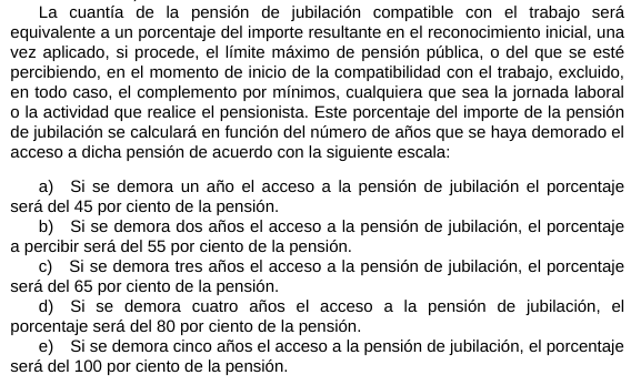 - Compatibilidad con incentivos de demora: Se permite acumular los beneficios por retrasar la jubilación con la jubilación activa, incentivando la prolongación de la vida laboral.